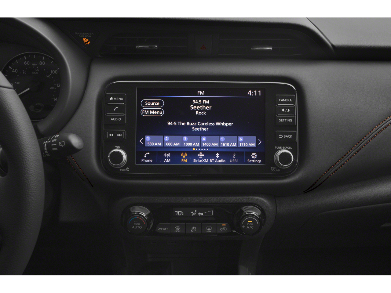 - Radio: AM/FM Audio System -inc: 8" color touchscreen display w/6 speakers, Bluetooth hands-free phone system, streaming audio via Bluetooth, Siri eyes free, audio and Bluetooth steering wheel switches, 3 USB ports (2 charge only), type C USB (front), NissanConnect featuring Apple CarPlay, Android Auto, SiriusXM satellite radio w/advanced audio features and hands-free text messaging assistant